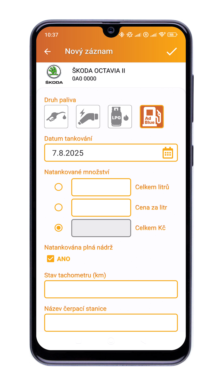 Nově můžete snadno zadat i tankování AdBlue. Zápis AdBlue probíhá stejně intuitivně jako zápis běžného tankování pohonných hmot, včetně možností přidat cenu, množství, stav tachometru, název a místo čerpací stanice nebo poznámku.