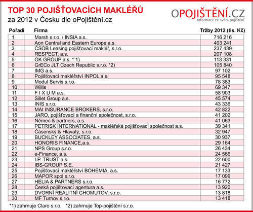 Redakce odborného portálu oPojištění.cz se inspirovala u významných pojišťovacích časopisů v USA (Business Insurance) a Velké Británii (Insurance Times) a po náročném průzkumu sestavila pořadí 30 největších pojišťovacích makléřů v Česku. Stejně jako obdobné žebříčky v zahraničí, porovnávali jsme jediné kritérium, které je objektivně ověřitelné, a to výšku tržeb z činnosti.