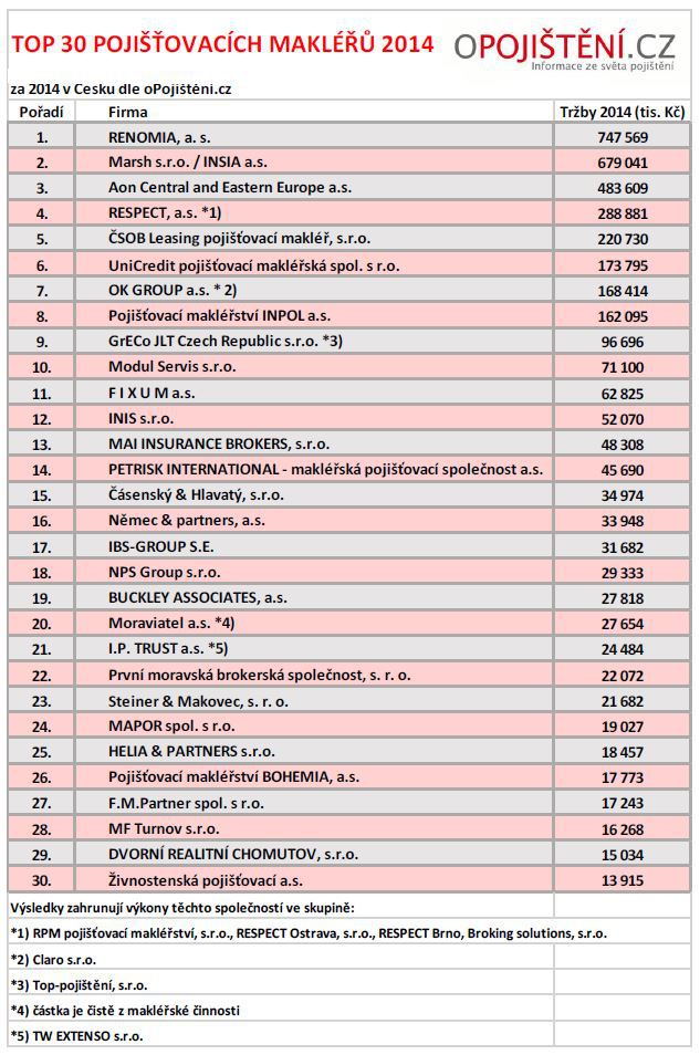 Před třemi lety redakce odborného portálu oPojištění.cz poprvé sestavila žebříček TOP 30 pojišťovacích makléřů v ČR. Rozhodujícím a jediným objektivně ověřitelným kritériem, ze kterého žebříček vychází, je výška tržeb z činnosti.
