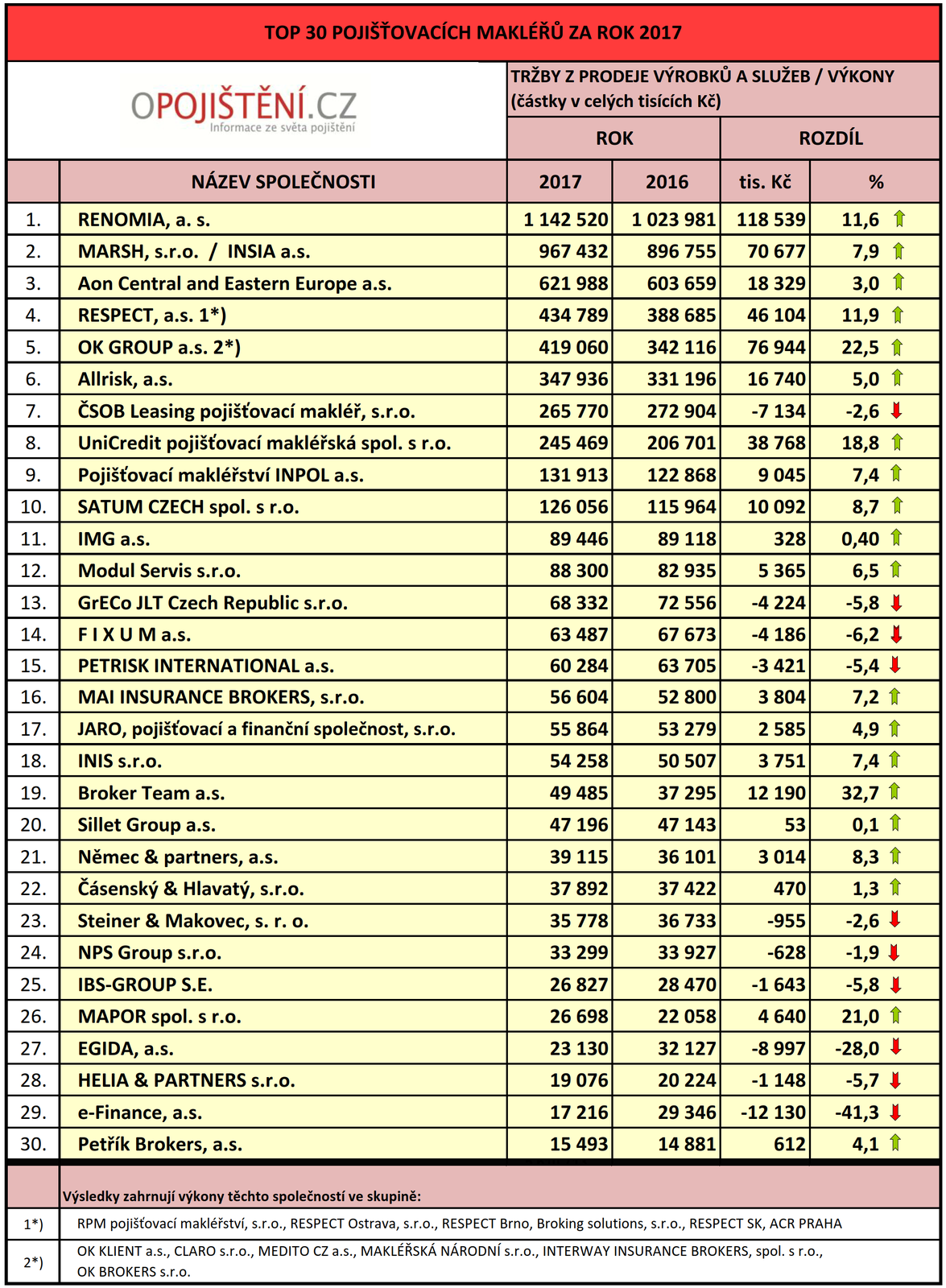 Velmi pozitivní zprávou je, že souhrnně všechny tržby makléřských společností, které se v žebříčku umístily, přesáhly částku pěti a půl miliard korun (5 610 713 Kč). Tržby společností INSIA a MARSH za rok 2017 se vyšplhaly na 967 432 Kč. Tržby všech makléřských společností vzrostly o cca 400 milionů Kč oproti předešlému roku, pokud srovnáme aktuální vykázané údaje, a to i nově zařazených firem. Pokud srovnáme výsledky uvedené v žebříčku v loňském roce, tak rozdíl v tržbách je dokonce cca 740 milionů Kč.