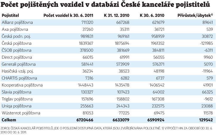 Orientovat se je možné například podle přehledu o počtu vozidel pojištěných u jednotlivých pojišťoven a jejich pololetních změnách, které zveřejňuje Česká kancelář pojistitelů. Z tabulky, která zachycuje poslední dostupné údaje k 30. červnu 2011, vyplývá, že nejvíce vozidel má stále povinné ručení od České pojišťovny, která na ně měla do roku 2000 monopol. Počet jejích pojistek na povinné ručení ale postupně klesá, na paty jí stále více šlape Kooperativa pojišťovna. Třetí příčku obsadila Česká podnikatelská pojišťovna, za níž následují Allianz, Generali, ČSOB Pojišťovna, Uniqa pojišťovna a Triglav pojišťovna.