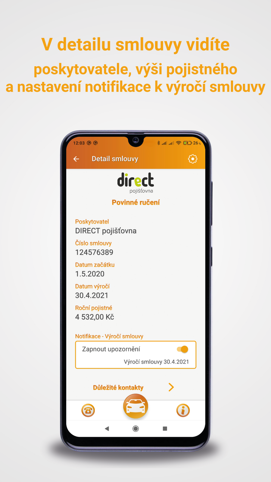 V aplikaci snadno naleznete kontakty na hlášení škodní události a linky pro pomoc řidičům. Navíc přesně víte, jaké pojištění vozidla máte. V detailu smlouvy vidíte infolinku a asistenční linku pojišťovny, u které máte dané pojištění sjednáno. Do aplikace si můžete vložit potřebné dokumenty a mít je tak vždy po ruce.