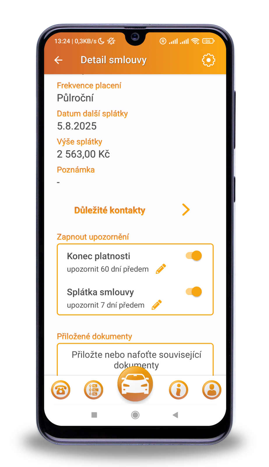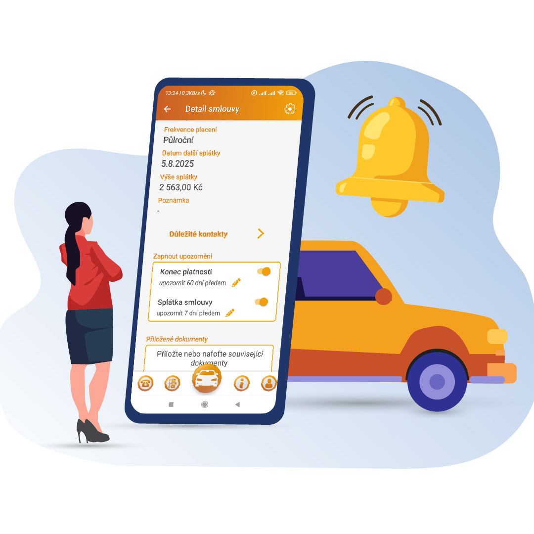 - Včasná upozornění: Aplikace vám v nastavený čas připomene blížící se platbu nebo konec platnosti pojištění.